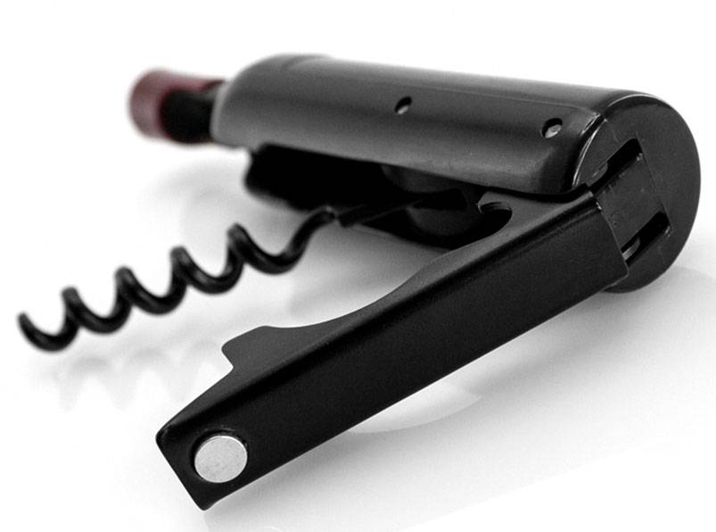 Divertido sacacorchos magnético con forma de botella de vino en color negro translucido con función de abridor.