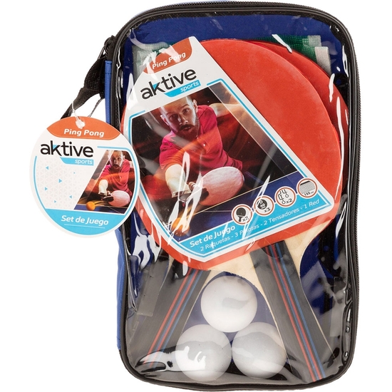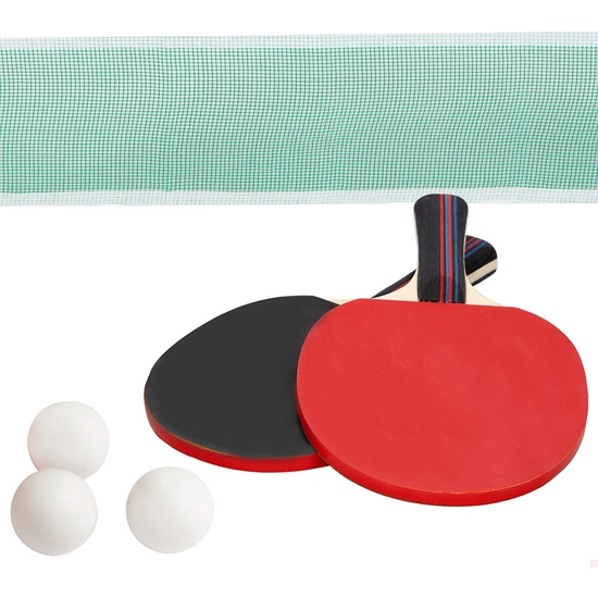 Set de Ping Pong en formato estuche de 27×16 cm, incluye dos palas, tres pelotas y red. Palas rojas, pelotas blancas y red azul.